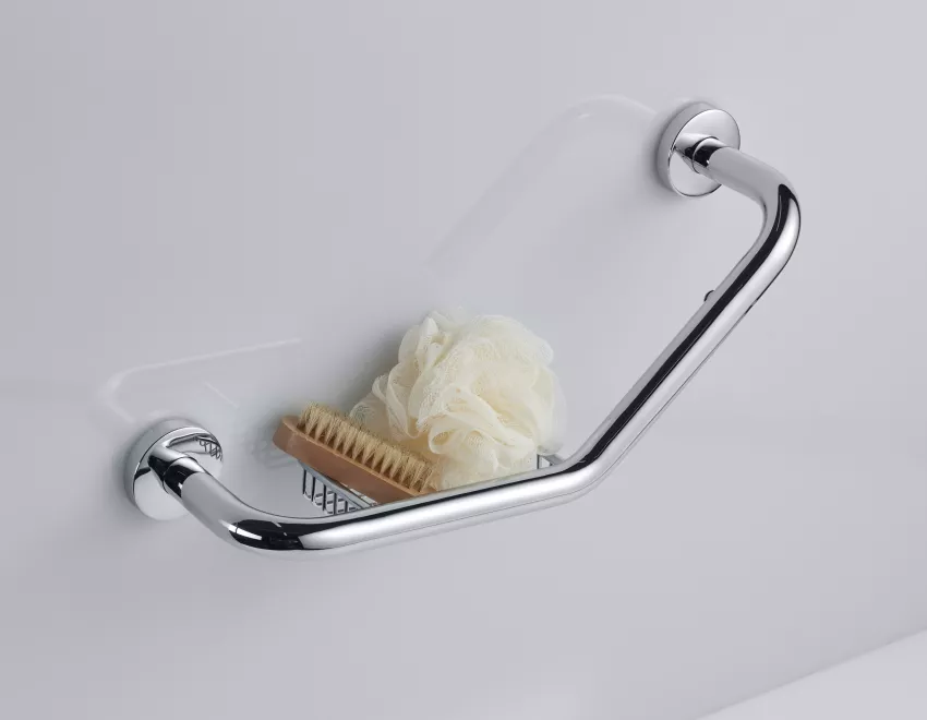 Der Winkelwannengriff mit Schale aus verchromtem Metall bietet eine praktische Lösung für zusätzlichen Halt und Aufbewahrung in deinem Badezimmer. Er vereint Sicherheit und Funktionalität in einem stilvollen Design.