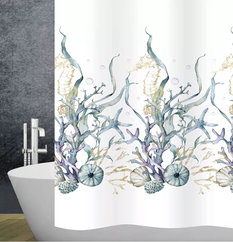 The decoratively designed Marina shower curtain, made from 100% recycled PET fibres, brings the calming properties of the sea into your bathroom ambience with its aquatic shades of turquoise, petrol, blue and purple paired with beige accents. Its beautiful composition with seahorses, anemones, corals and starfish invites you to dream and creates an instant holiday mood. Thanks to its high-quality coated polyester fabric, it is water-repellent yet pleasant to the touch. An integrated environmentally friendly weighting tape (lead-free) ensures a perfect drape. The shower curtain is certified to OEKO-TEX Standard 100 and has sturdy eyelets that fit both the shower curtain rail and the rail. With colour-coordinated bath rugs or towelling rugs, stylish accessories and a matching room fragrance, nothing stands in the way of you turning your bathroom into your own personal little oasis of well-being.