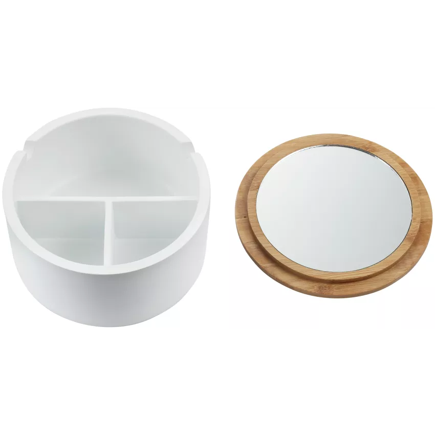 Cette boîte à bijoux stylée et élégante avec un couvercle en bambou combine miroir et rangement dans un design pratique. Elle n'est pas seulement fonctionnelle, mais aussi un élément décoratif pour votre salle de bain.