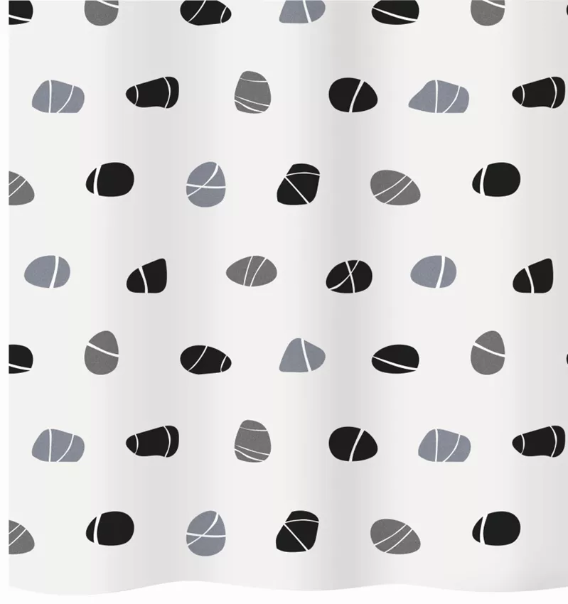 Der Duschvorhang Stones verleiht deinem Badezimmer einen attraktiven Akzent und bringt eine gewisse Raffinesse in den Raum. Das strukturierte Stein-Design in den Farben grau, schwarz und weiss fügt sich hervorragend in jedes Bad ein.